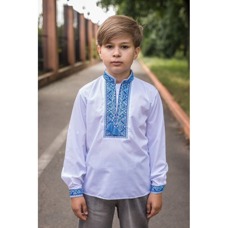 Вышитая рубашка для мальчика 5–12 лет, батист, белая, длинный рукав, натуральная вышивка ,140, Белый с синим