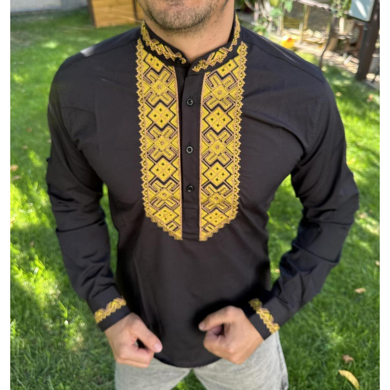 Вышитая мужская рубашка Varetti из хлопка — стильная приталенная вышиванка , Черный с желтым, XXL