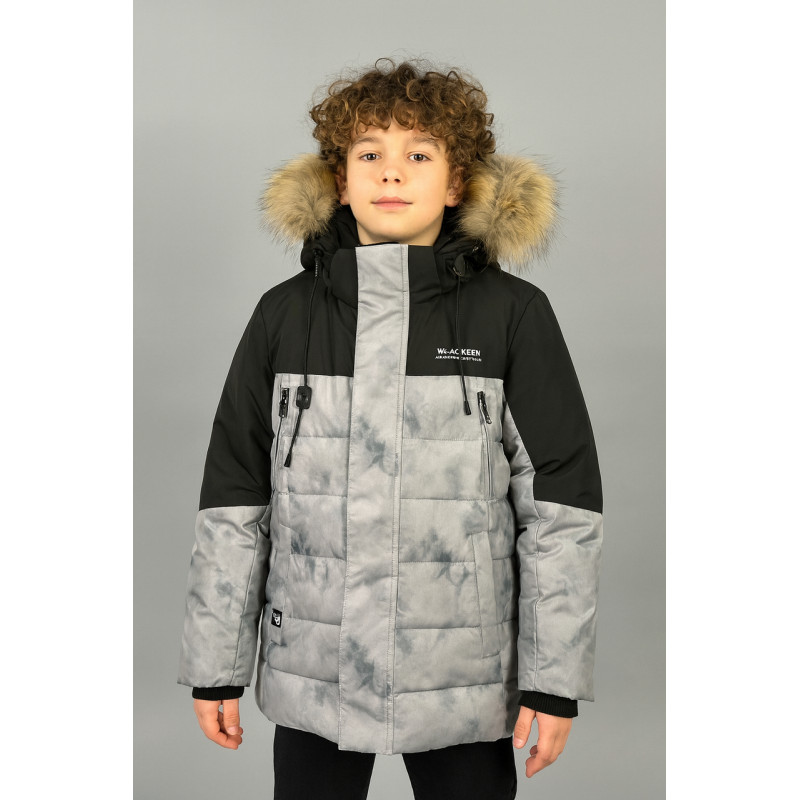Куртка WKAS для мальчика 8-12 лет зимняя теплая с капюшоном и натуральным мехом,Серый, 128