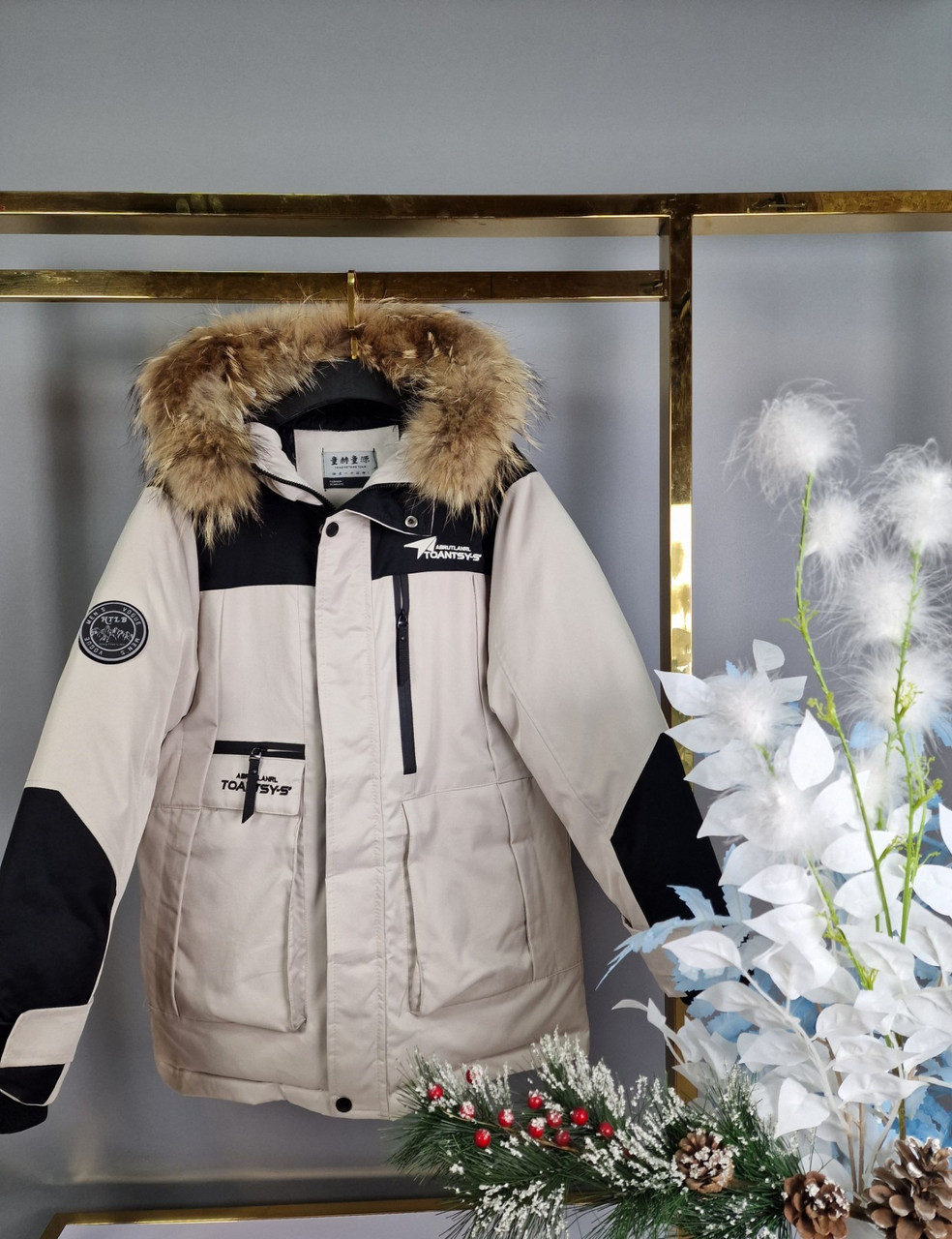 Скрытый манжет в рукавах,качественная фурнитура.Защита молнии планкой на кнопках.Непромокаемая и ветронепроницаемая,грязеотталкивающая,дышащая наружная ткань.Регулировка ширины куртки внизу и рукава.Полноценный капюшон с натуральным мехом,который при необходимости можно отстегнуть..Ваш парень всегда будет неотразим и в тепле.