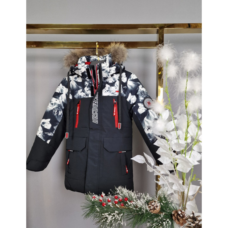 Куртка зимова довга WKAS для хлопчика 5-10 років арт.1133, Чорно-білий з червоним, 104