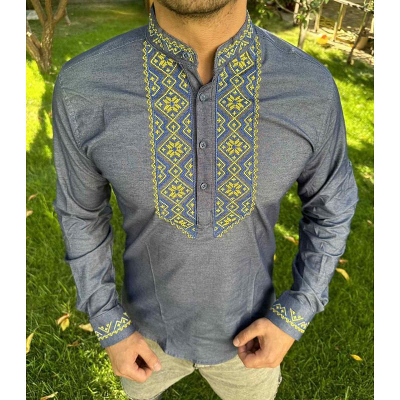 Вышитая мужская рубашка Varetti из хлопка — стильная приталенная вышиванка , Джинс, XXXL