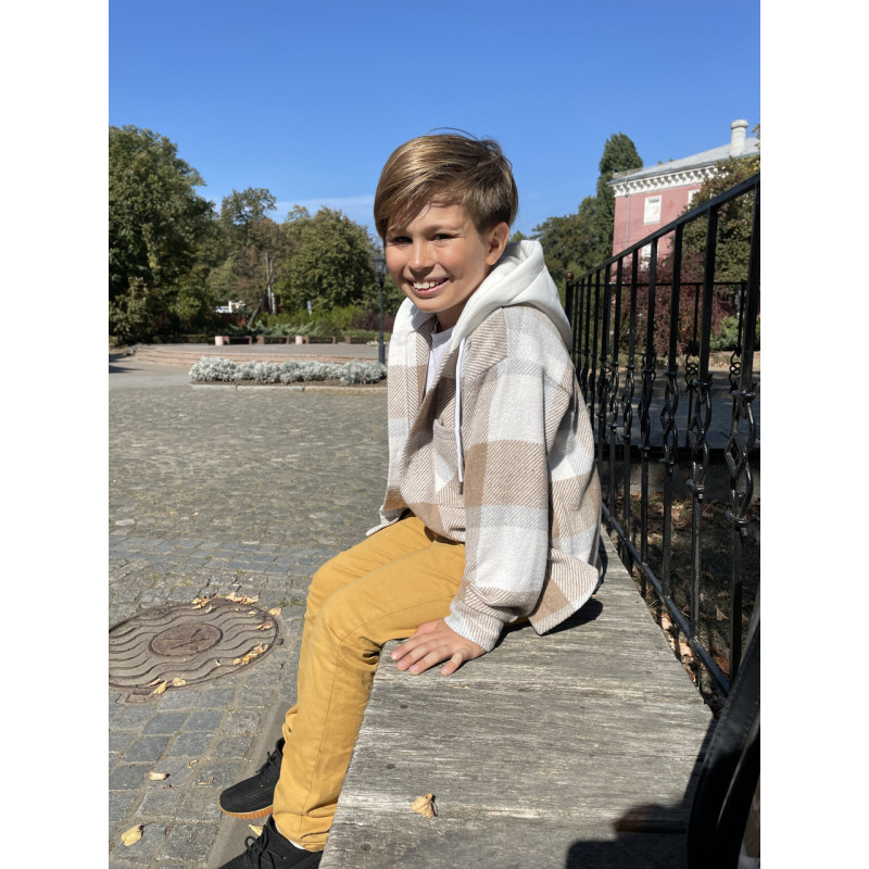 Рубашка в клетку оверсайз с капюшоном для мальчика 5-9 лет, кашемир, Турция,Бежевый, 110