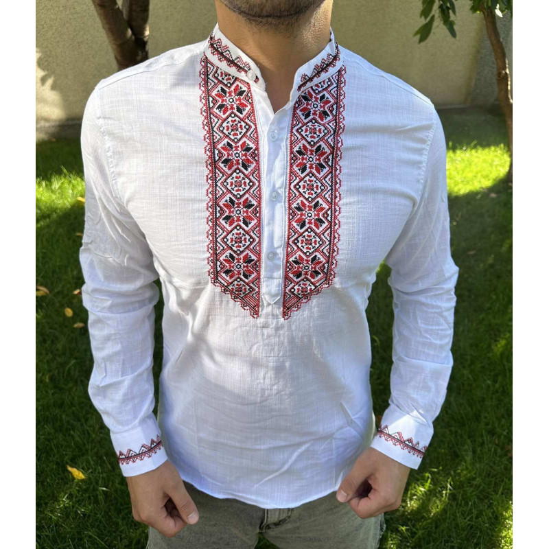 Вышитая мужская рубашка Varetti из хлопка — стильная приталенная вышиванка , Белый с красным, XXL