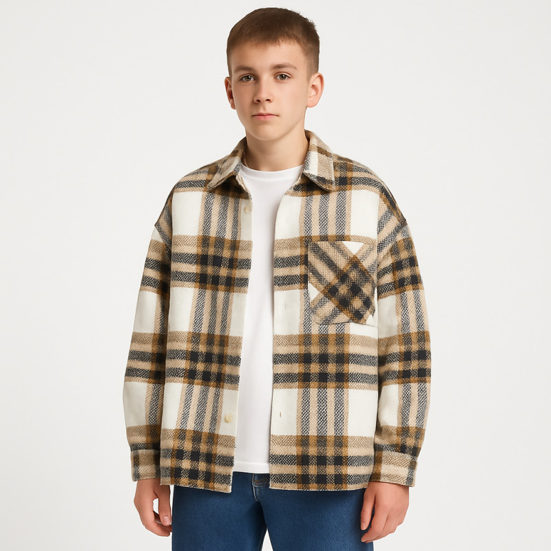 Тепла підліткова сорочка оверсайз у клітку – must-have сезону для стильних хлопців та підлітків! Виготовлена з м'якого кашеміру з додаванням зовні, вона дарує максимальний комфорт і затишок навіть у прохолодну погоду. Вільний крій оверсайз створює модний сучасний образ та гарантує свободу рухів. Сорочку можна носити як легку верхню одежу або як стильну кулю поверх футболки. Ідеально підходить для школи, прогулянок, зустрічей із друзями та щоденного гардеробу. Чудовий вибір для віку 10–16 років – стильно, тепло та комфортно щодня!