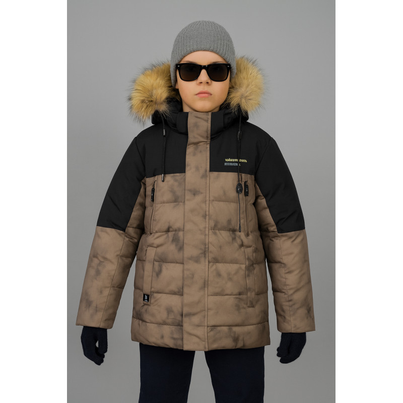 Куртка WKAS для мальчика 8-12 лет зимняя теплая с капюшоном и натуральным мехом,Коричневый, 152